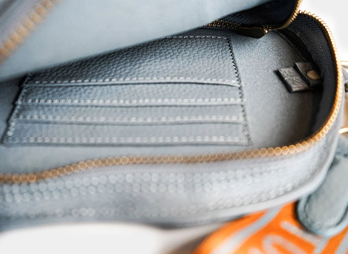 Il dispose d’un porte-carte extérieur, d’une poche zippée sur le devant, ainsi que d’un intérieur doublé en microfibre douce type suédine.