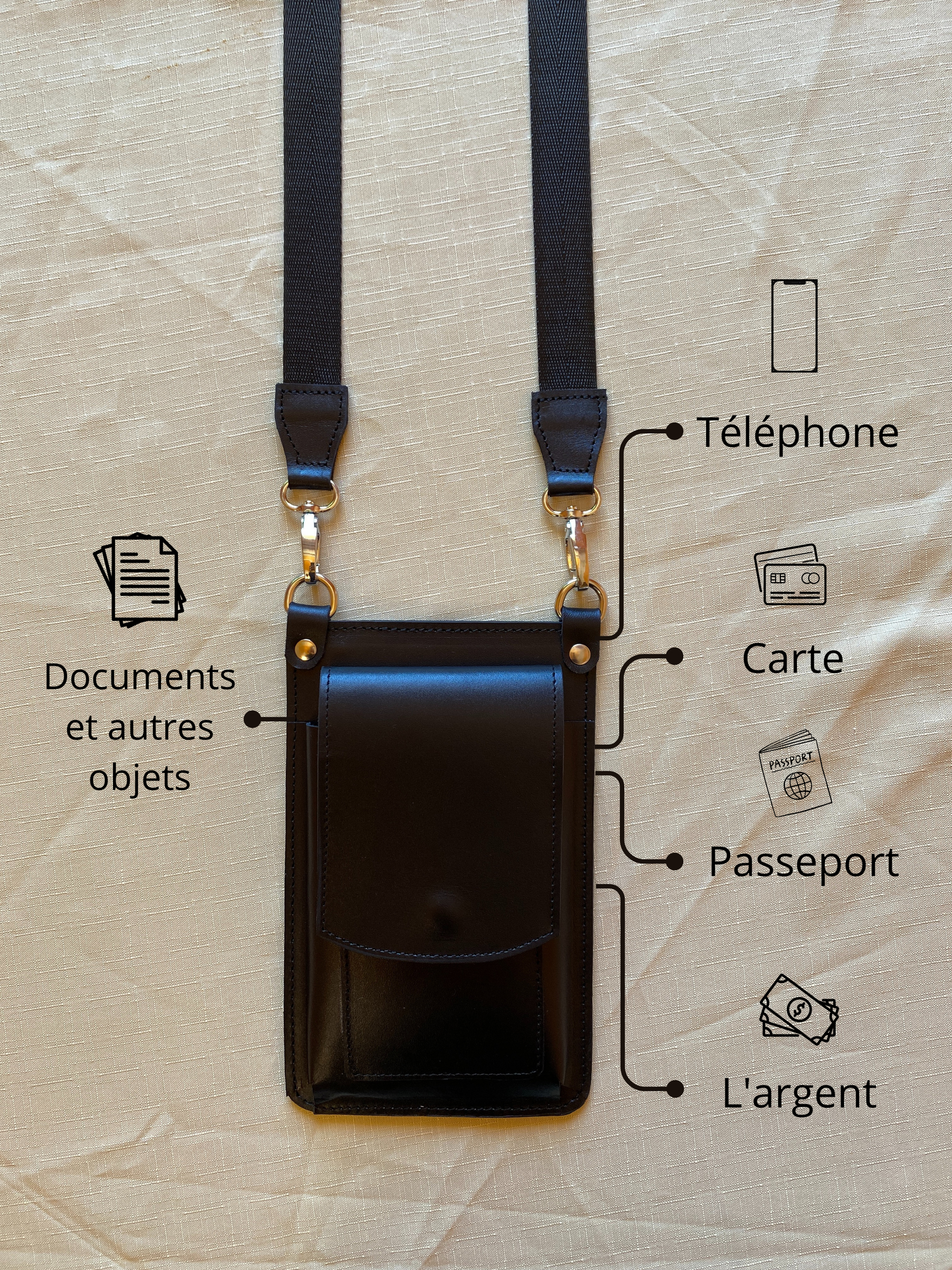 Compartiments intelligents – Espace dédié pour votre téléphone, cartes bancaires, passeport, billets et documents importants.